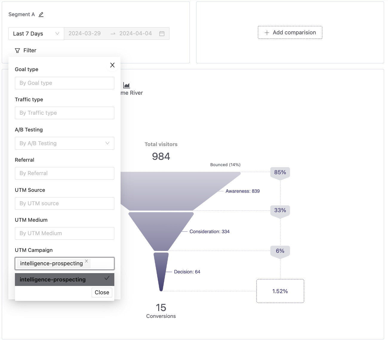 While viewing the Buying Journey report, click on “Add Comparison.” Choose the date range you’re interested in comparing, and then enter the name of the campaign you wish to analyze into “Segment B.”